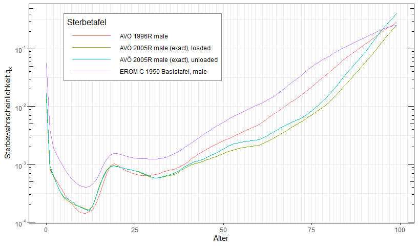 plotMortalityTables(AVOe2005R.male, AVOe2005R.male.unloaded, AVOe1996R.male, EROM.G1950.male,