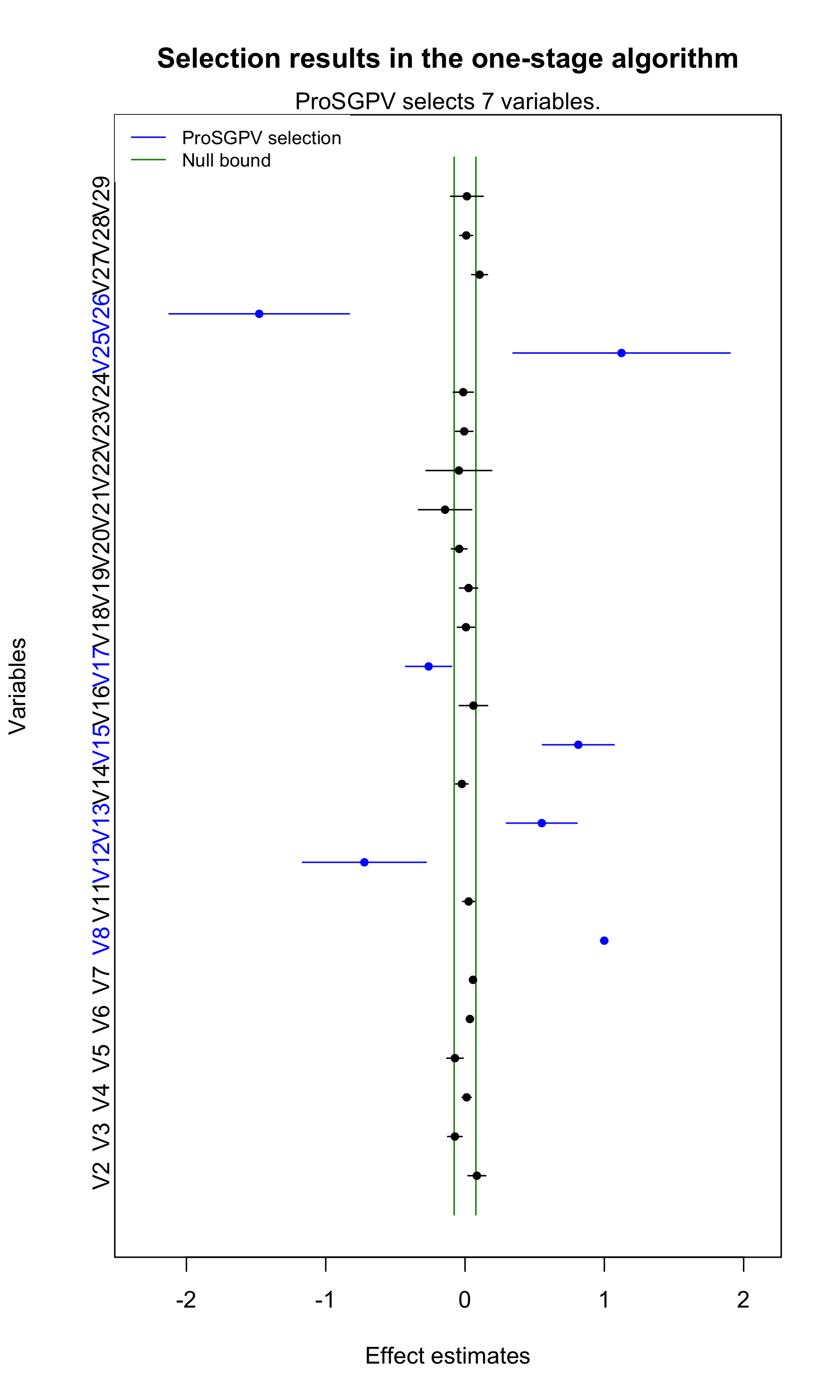 Moreover, plot function can be used to visualize the variable selection process for the one-stage algorithm. Point estimates and 95% confidence intervals are shown for each variable, and the null bounds are shown in green vertical bars. Selected variables are colored in blue.