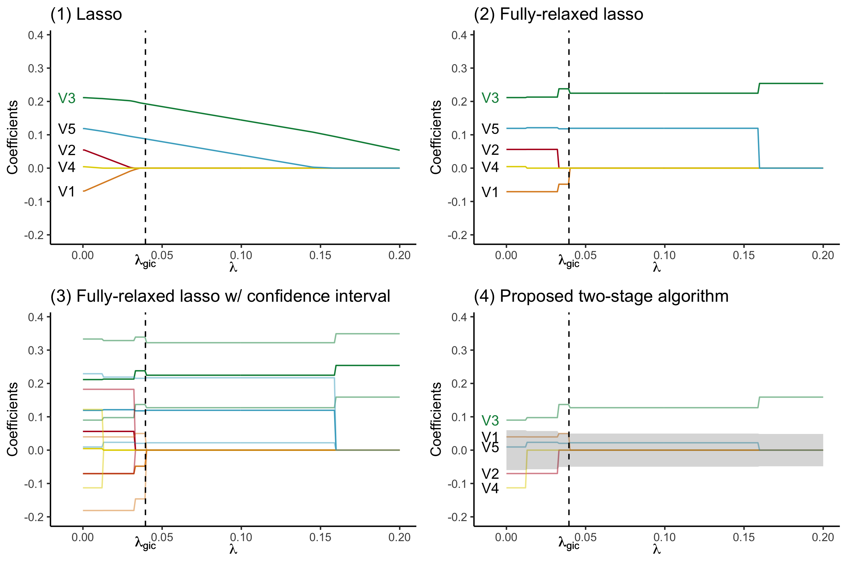 Below is an illustration of how ProSGPV successfully selects the true support, while lasso and fully relaxed lasso fails. Five variables are simulated and only V3 is associated with the response. Plot (1) presents the lasso solution path. The vertical dotted line is the lambda selected by generalized information criterion. (2) shows the fully relaxed lasso path. (3) shows the fully relaxed lasso paths with their 95% confidence intervals (in lighter color). (4) illustrates the ProSGPV algorithm selection path. The shaded area is the null region; the colored lines are each 95% confidence bound that is closer to the null region. Lasso and fully relaxed lasso would select both V5 and V3, while ProSGPV successfully screens out V2.