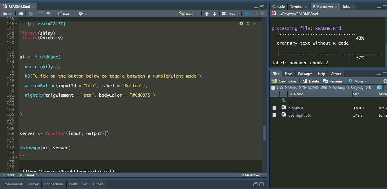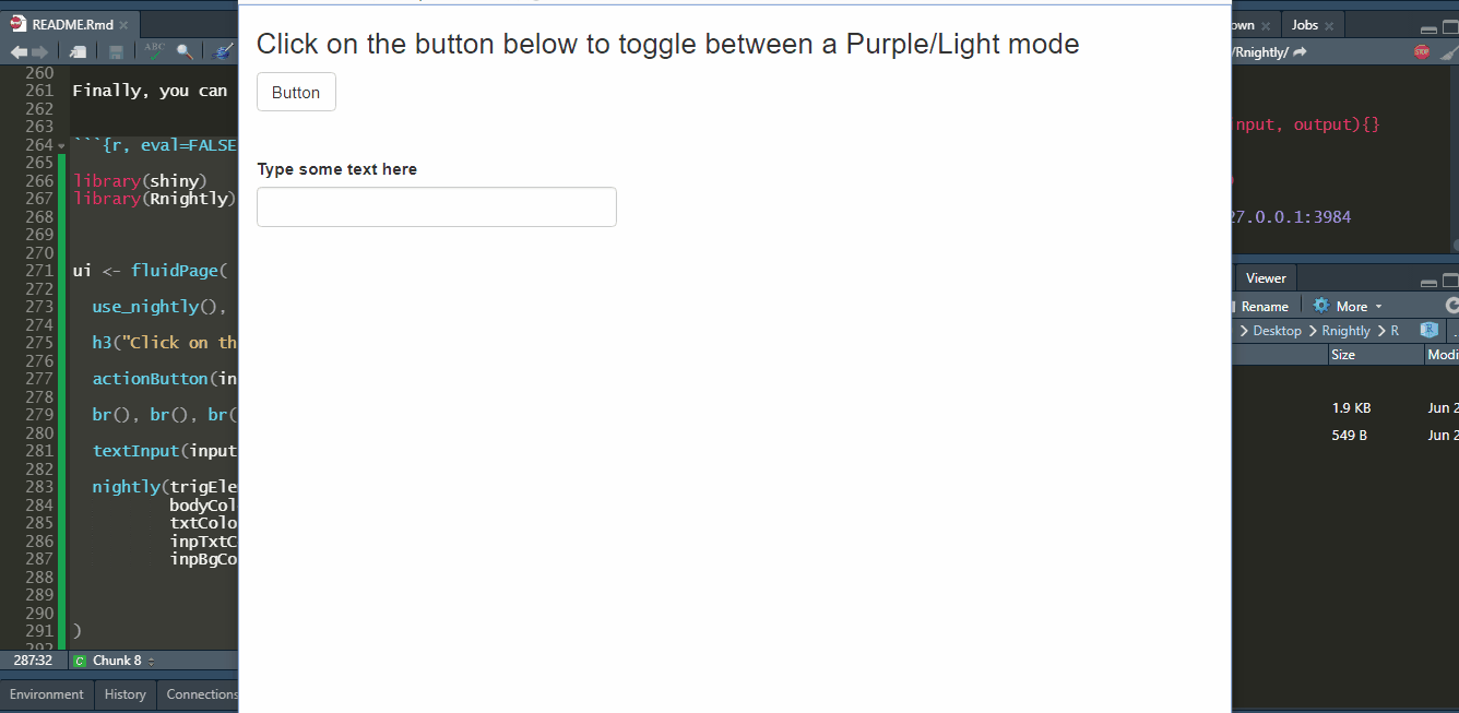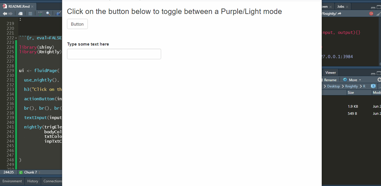 The goal of Rnightly is to implement a Dark/Light toggle mode in your Shiny user interface. You can also change the default behavior by specifying other colors.