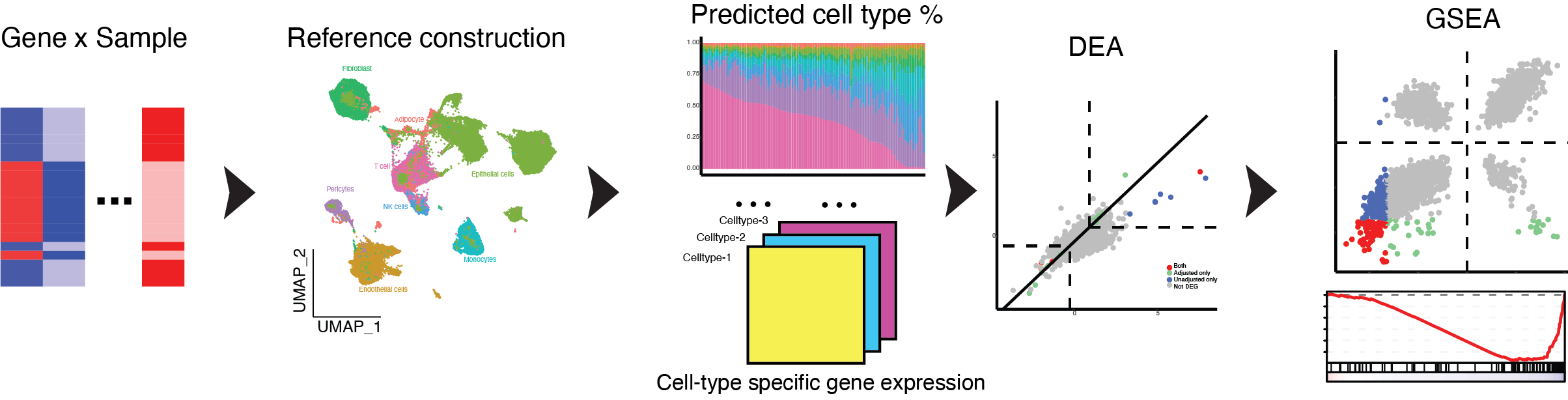 SCdeconR aims to provide a streamlined workflow from deconvolution of bulk RNA-seq data to downstream differential and gene-set enrichment analysis. SCdeconR provides a simulation framework to generate artificial bulk samples for benchmarking purposes. It also provides various visualization options to compare the influence of adjusting for cell-proportions differences on differential expression and pathway analyses.