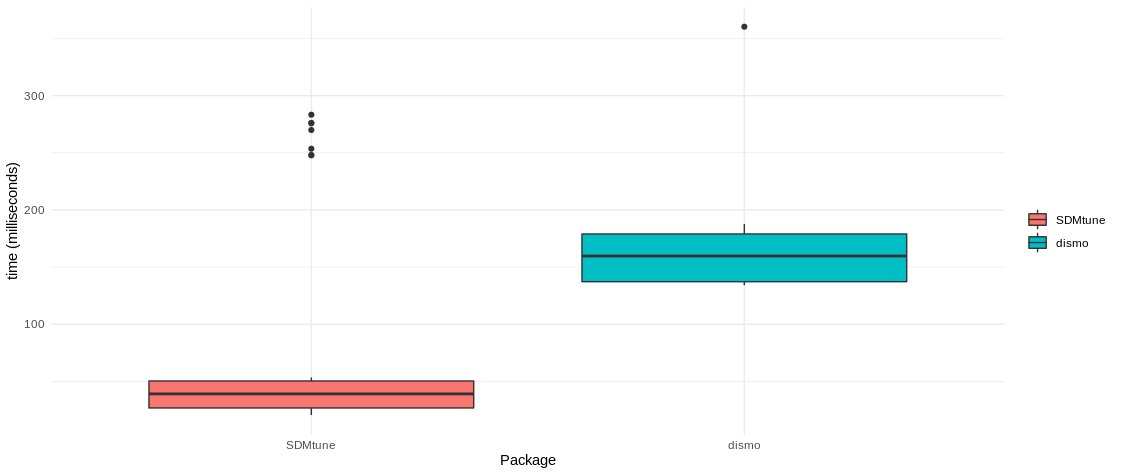 sdmtune_model <- train(method = "Maxent", data = data)We compare the execution time of the predict function