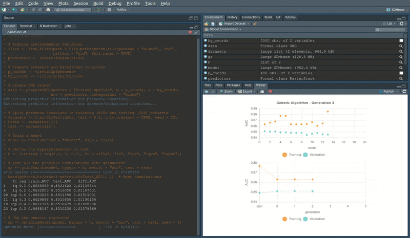 SDMtune provides a user-friendly framework that enables the training and the evaluation of species distribution models (SDMs). The package implements functions for data driven variable selection and model tuning and includes numerous utilities to display the results. All the functions used to select variables or to tune model hyperparameters have an interactive real-time chart displayed in the RStudio viewer pane during their execution. Visit the package website and learn how to use SDMtune starting from the first article Prepare data for the analysis.