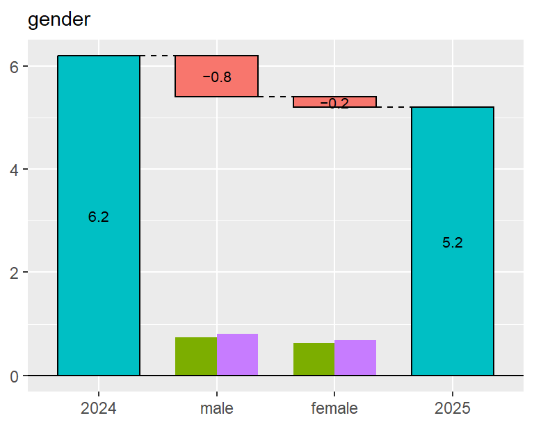 For instance, suppose the metric was 6.2% in 2024 and decreased to 5.2% in 2025. Again, we focus on gender. We replace the male data within the 2024 dataset with the male data from 2025 and recalculate the metric. As a result, the metric would drop by 0.8 percentage points, reaching 5.4%. In this case, the contribution of the male group to the change in the metric is -0.8 percentage points. Next, we replace the female data from 2024 with that from 2025. The dataset then consists entirely of 2025 data, and the metric drops by 0.2 percentage points, reaching 5.2%. Thus, the contribution of the female group is -0.2 percentage points.