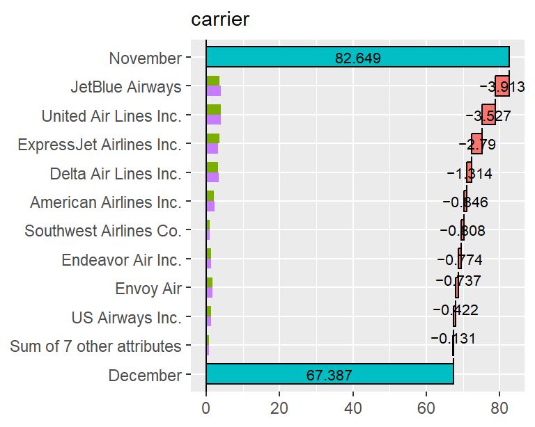 We use the 2013 New York City flight data from nycflights13 as a demo dataset. Here, we will define the rate metric as the proportion of flights that arrived on time. In December 2013, the on-time arrival rate dropped substantially compared to November. We investigate the cause using a Theseus plot.
