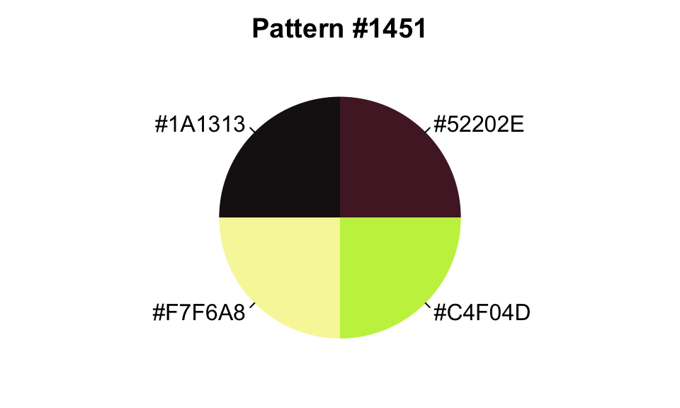 #> [1] "#52202E" "#1A1313" "#F7F6A8" "#C4F04D"The response includes the creator’s username, COLOURlovers ratings (views, votes, comments, hearts, and rank), the palette of colors (in hexidecimal representation) used in the pattern, and URLs for the images of the pattern.