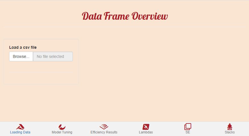 Hit Browse… to upload your data frame in a csv format. All the inputs and outputs must be contained within the uploaded data frame. Further, the data frame needs to contain an identification column in order to identify Decision Making Units distinctively. It can be a numeric or a character column.