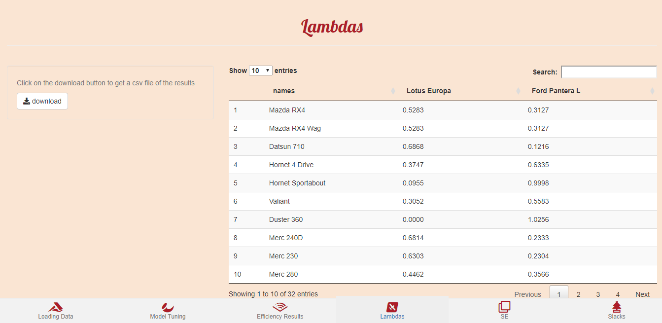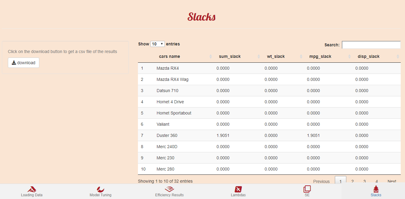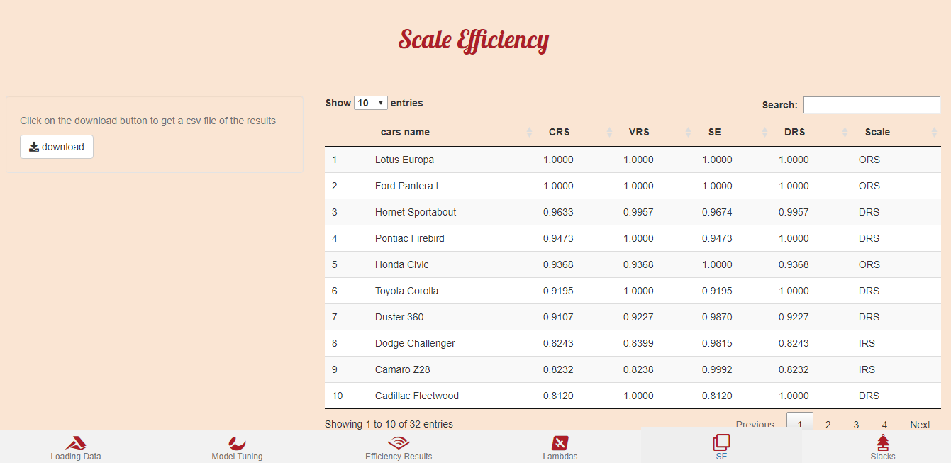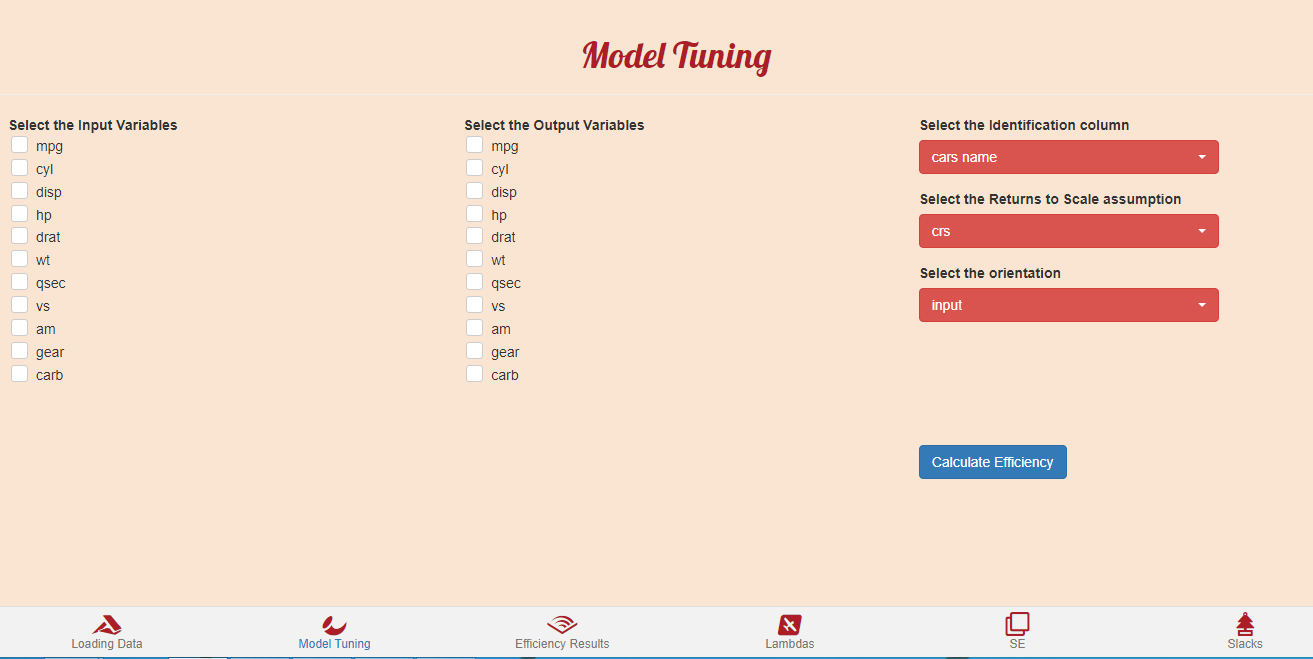 Within the Model Tuning tab, you will select the input and output variables, then you determine your identification column. Then you choose the Returns to Scale assumption between: crs, vrs, irs, drs, add and fdh. After that, you determine the orientation of the model, whether input or output. Finally, hit Calculate Efficiency to get the results.