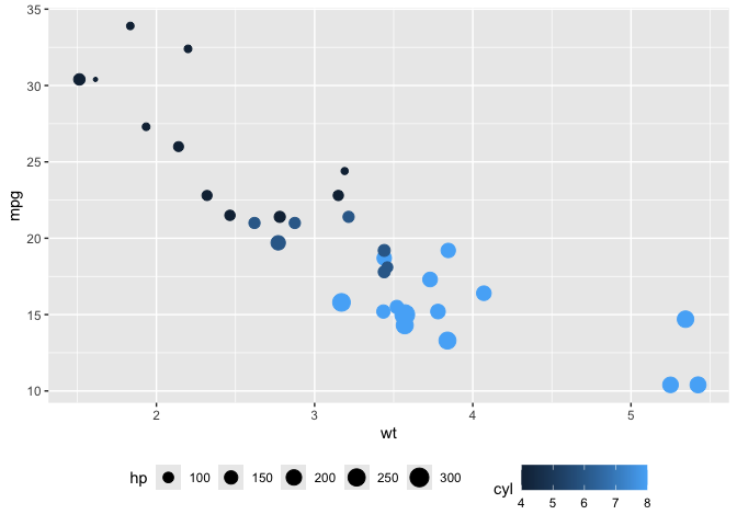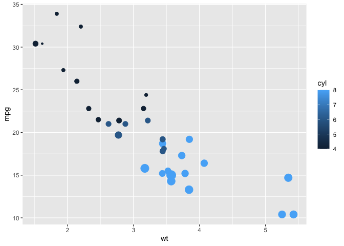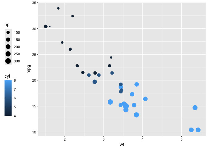 ggplot(mtcars, aes(wt, mpg, colour = cyl, size = hp)) +