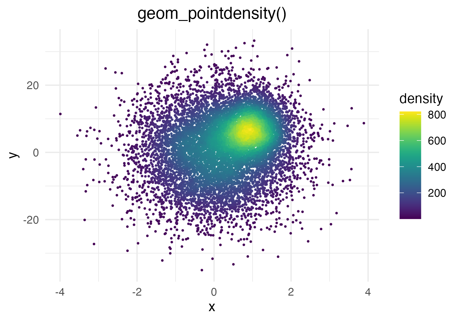devtools::install_github("LKremer/ggpointdensity")There are several ways to visualize data points on a 2D coordinate
