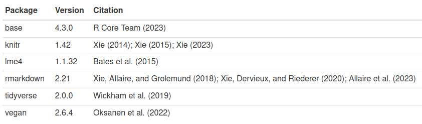 We used R version 4.2.3 [@base] and the following R packages: lme4 v. 1.1.32 [@lme4], tidyverse v. 2.0.0 [@tidyverse], vegan v. 2.6.4 [@vegan].