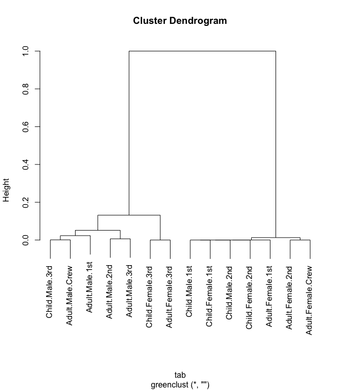 tab <- tab[apply(tab, 1, sum) > 0, ]This gives us a contingency table with several levels, showing the total number of passengers who survived (or not) at each level: