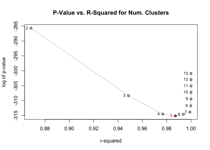 The package provides a diagnostic plotting function that shows the r-squared and chi-squared test p-value for each potential number of groups/clusters. This can be a useful tool when weighing the trade-off between fewer clusters and lower r-squared: