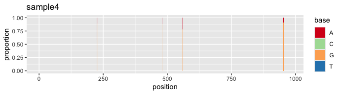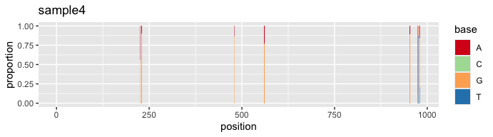 The plot above captures atypical SNVs towards the 3’ end of the sample 4 alignment, which is potentially caused by sequencing error. We can address this issue using the “vqscustompct” function, which allows us to adjust the % cut-off for noise minimization at specific range(s) in the alignment. In the case of sample 4, we increase the % cut-off from position 972 onward, raising it from 10% to 30%.