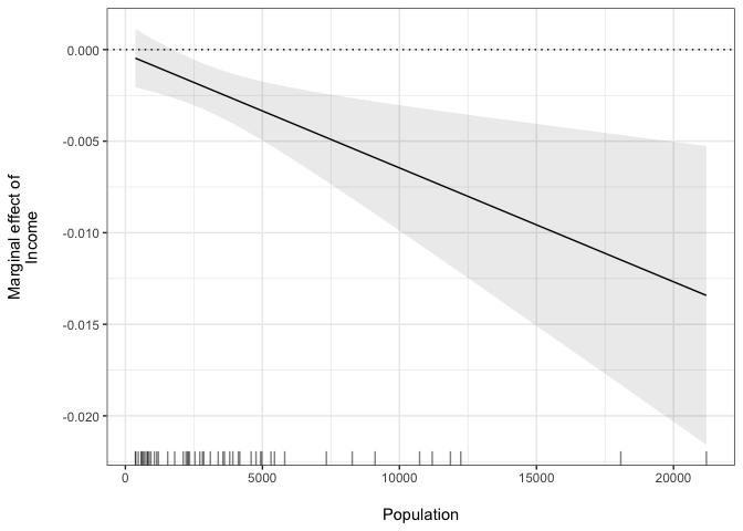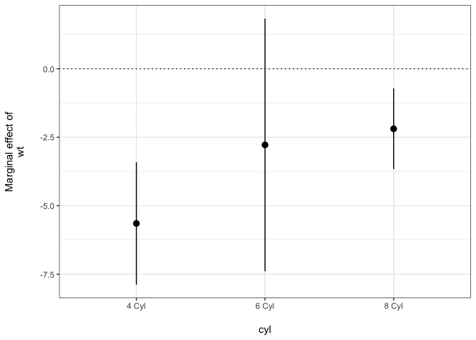 When the second term in the interaction is a categorical (factor) variable then point-ranges are plotted. Note that the marginal effect is in terms of the reference category: