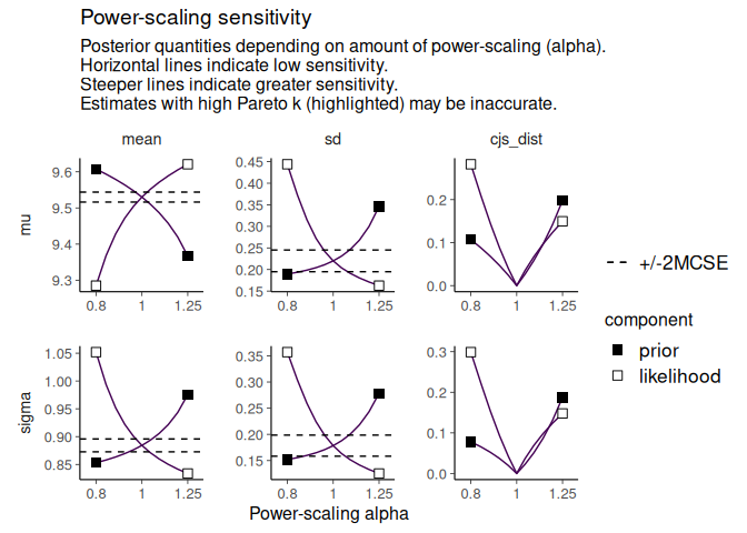Power-scaling sensitivity analysis and priorsense are described in Kallioinen et al. (2023).