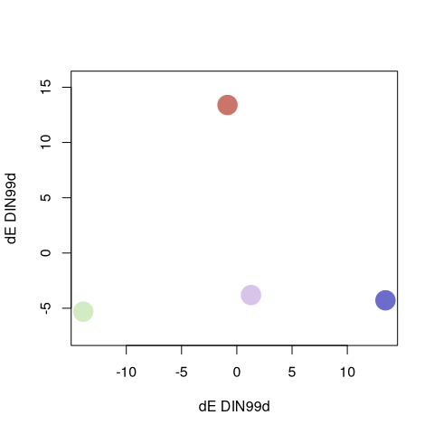 #> #d2ebc3 27.38009 19.24089 23.00737The palette may also be plotted with in a multidimensional scaling plot generated from the distance matrix of the colors in the palette.