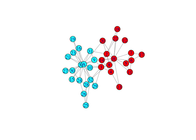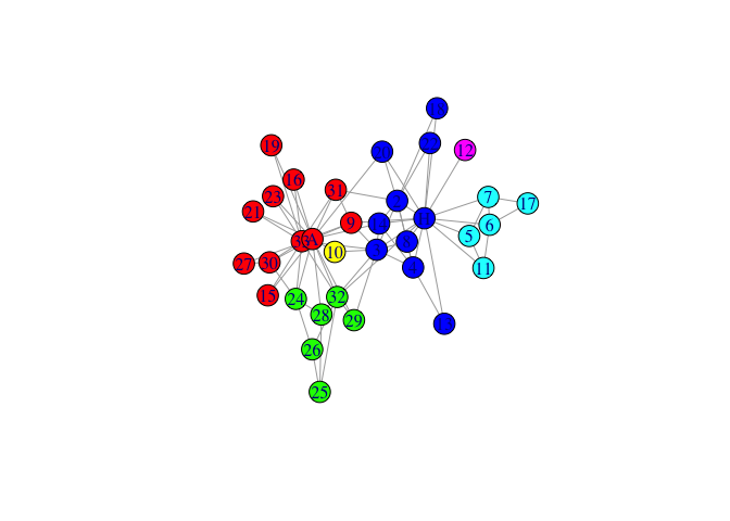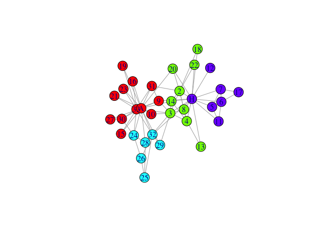 mem0<-igraph::membership(rSpectral::spectral_igraph_communities(karate))palette <- rainbow(max(as.numeric(mem0)))