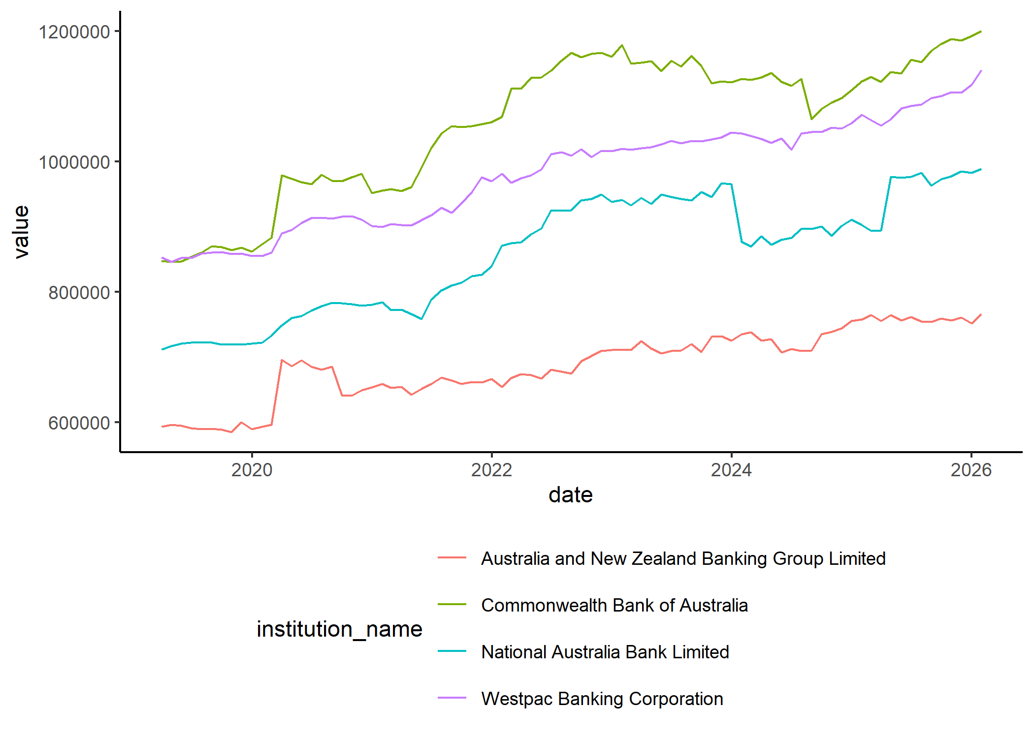 The ability to download and import APRA’s statistical publications with readapra greatly eases the analysis and visualisation of this data via packages such as ggplot2.