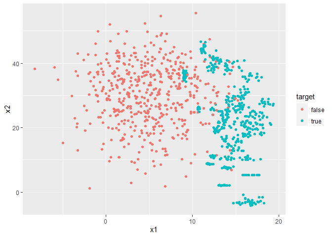 library(ggplot2)Now lets generate an imbalanced dataset.