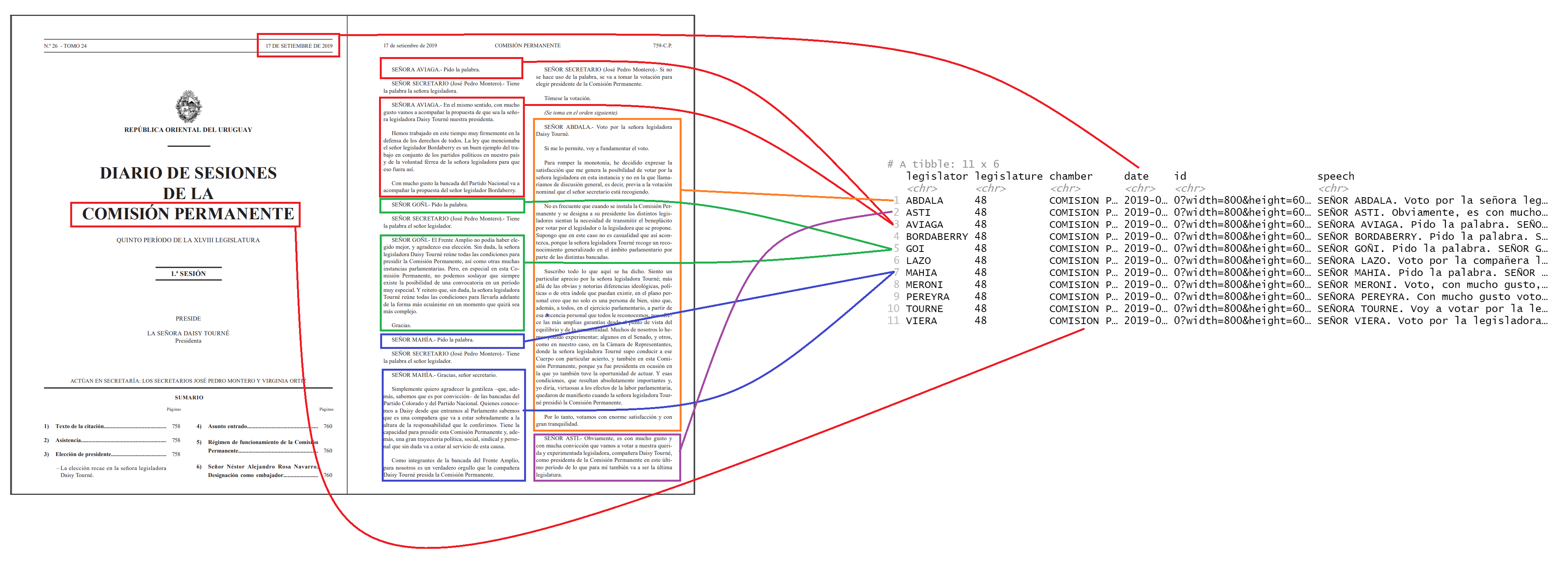 Converts the floor speeches of Uruguayan legislators, extracted from the parliamentary minutes, to tidy data.frame where each observation is the intervention of a single legislator.