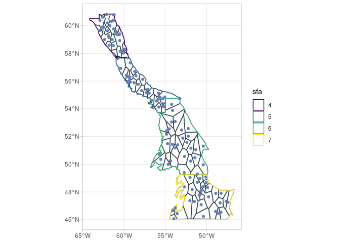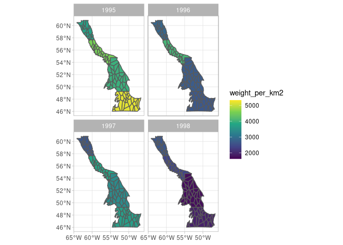 The goal of sspm is to implement a gam-based spatial surplus production model, aimed at modeling northern shrimp population in Canada but potentially to any stock in any location. The package is opinionated in its implementation of SPMs as it internally makes the choice to use penalized spatial gams with time lags based on Pedersen et al. (2020). However, it also aims to provide options for the user to customize their model.
