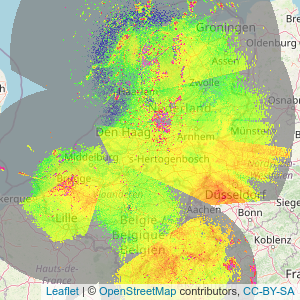 The goal of starsTileServer is to provide a simple way to add large data sets in R to a leaflet application. Examples are available on the website. Because it is possible to provide functions pretty much any data that can be projected can be visualized, for example composites or non square grids. This is en example of using data from meteorological radar:
