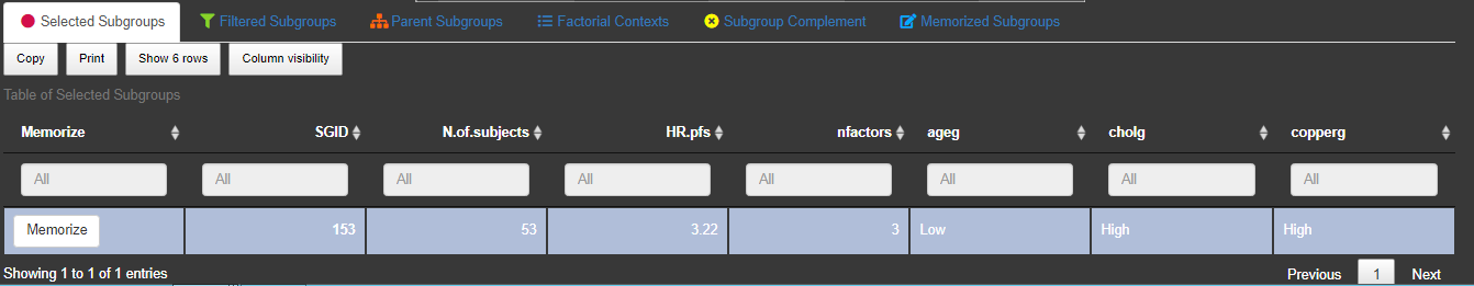 If (factorial=TRUE) the calculation of factorial contexts is performed, which is required for the ASMUS-tab (see chapter 3.5). The calculation time of subscreencalc increases if the parameter factorial is set to TRUE. A factorial context is defined as the combination of all factor levels of a given subgroup. As an example, for a subgroup with three factor combination sex: f, ageg: High and cholg: Low (all factor variables with 2 levels) the factorial context includes eight subgroups. The concept of factorial contexts will be explained in more detail in chapter 3.5.1.