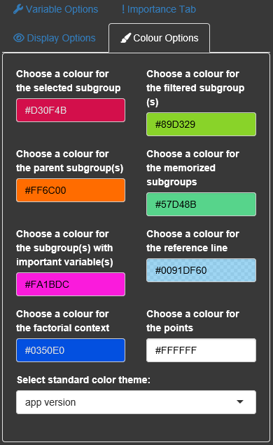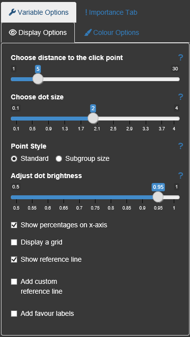 Within the Display options the user can change dot size and click/select radius. The dot size can be changed to be related to the number of subjects for each subgroup. The colour brigthness is also adjustable.