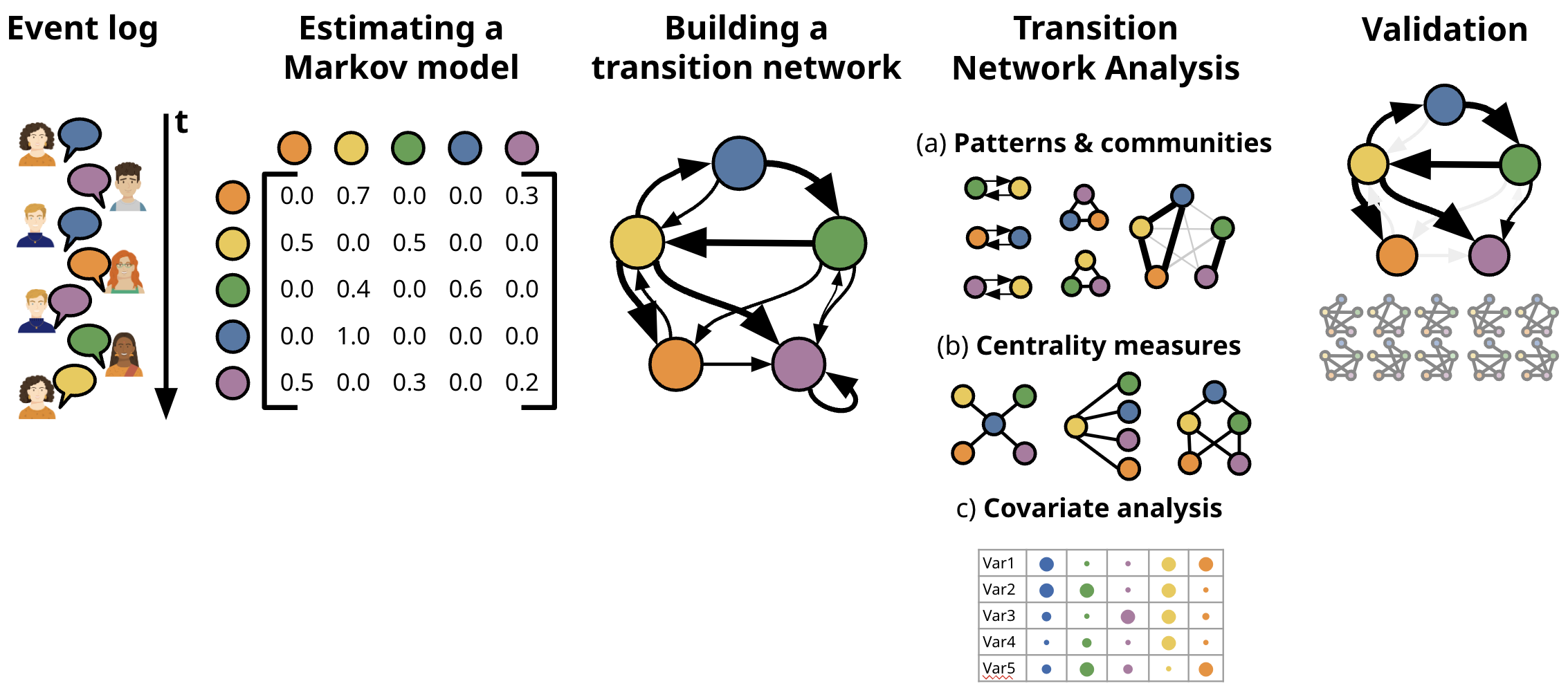 | Saqr, M., Lopez-Pernas, S., & Tikka, S. Mapping Relational Dynamics with Transition Network Analysis: A Primer and Tutorial | https://doi.org/10.1007/978-3-031-95365-1_15 | Online tutorial |