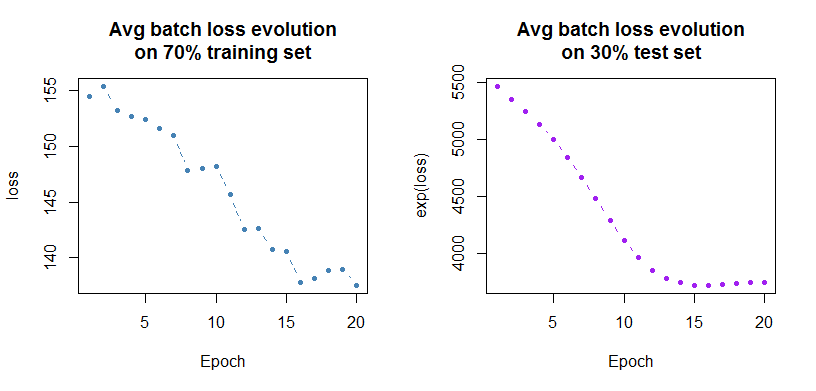 loss <- model$fit(data = dtm, optimizer = optimizer, epoch = 20, batch_size = 1000)