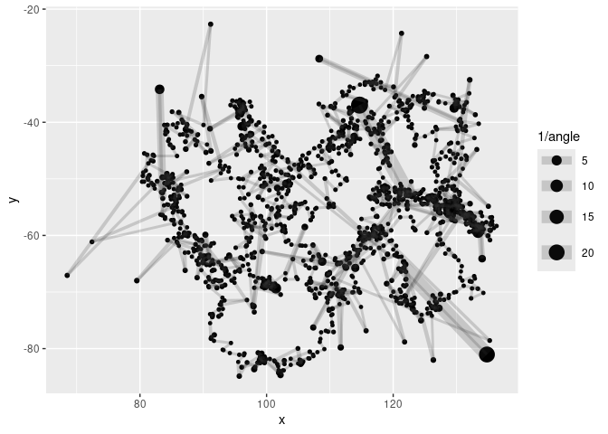 ggplot(aes(x, y, cex= 1/angle)) +