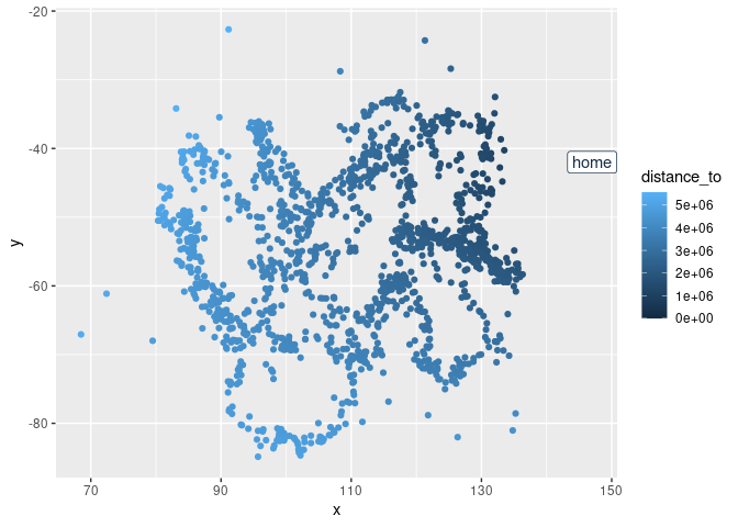geom_point() + geom_label(data = data.frame(x = 147, y = -42, distance_to = 0),