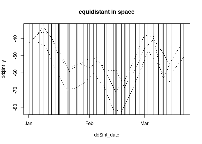 plot(dd$int_date, dd$int_y, pch = ".", cex = 2, main = "equidistant in space")