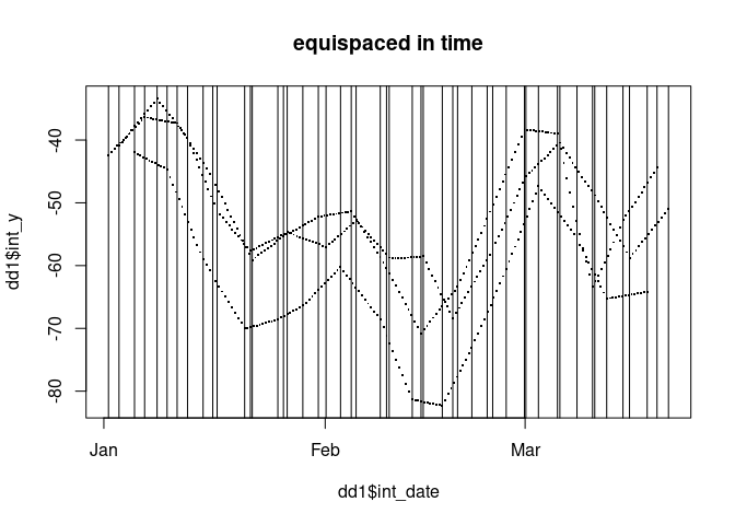 plot(dd1$int_date, dd1$int_y, pch = ".", cex = 2, main = "equispaced in time")