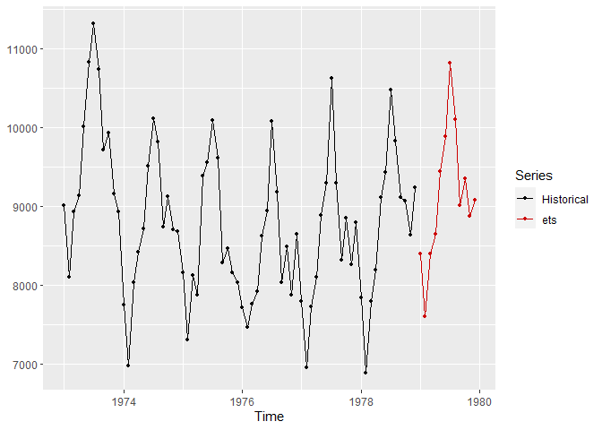 plot_ts(USAccDeaths, prediction = ets_f$mean, method = "ets")