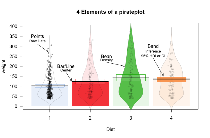 The pirateplot function creates a pirateplot, a transparent (both literally and figuratively) plot for displaying continuous data as a function of 1, 2, or 3 discrete variables. Unlike traditional plots, like barplots and boxplots, the pirateplot shows both raw data (jittered points), descriptive statistics (line and/or bar), and inferential statistics (95% Bayesian Highest Density Intervals or Confidence Intervals), in one plot. While the default plot shows all these elements, the user can easily customize the transparency of each element using additional arguments.