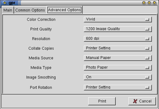 Once you've configured your printer in GPR, you can print jobs by specifying the filename and selecting the proper options from the `Common' and `Advanced' tabbed panels. The `Common' options are implemented directly by GPR for all printers, while the `Advanced' options are defined by the PPD file for your printer. You can see these option panels in Figure 8 and Figure 9.