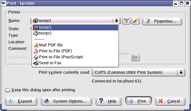 KDEPrint allows users access to printing subsystems (CUPS, LPD, RLPR, LPRng etc.) through a KDE graphical user interface. With KDEPrint, you can easily print, administer jobs and printers and the printing daemon. KDEPrint is a replacement for the old QtCUPS and KUPS. It is easy to use for both developers and users. KDEPrint is already a part of KDE since 2.2.0 and has several nice features.