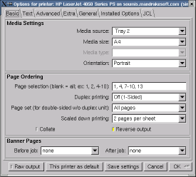 To print with XPP, simply run the xpp program, and specify a file (or nothing, if you're using xpp in place of lpr to print from stdin). Then select a printer from the list of configured printers, and select any options you'd like to apply from the various tabbed panels. See Figure 5 for an example options panel highlighting the standard CUPS options.