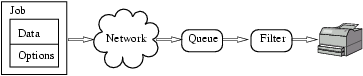The user submits a job along with his selection of options. The job data is usually, but not always, Postscript.